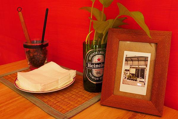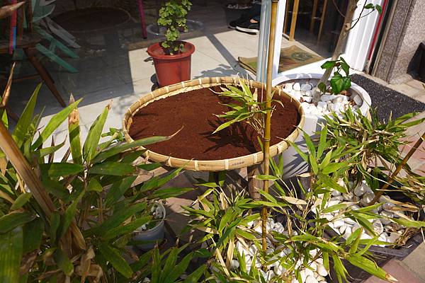 門口裝飾頗有禪風,還放了一籃咖啡渣在曬太陽。