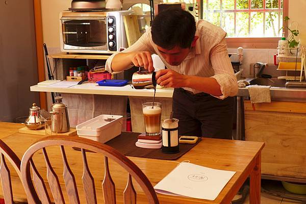 看他仔細指導女學生拉奶泡並回答他們的問題,