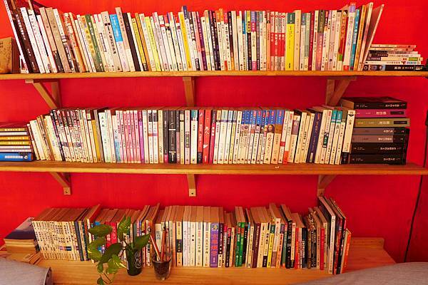 沙發座緊靠著書牆,牆上擺滿了各種文學作品,